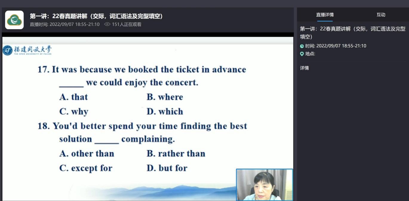 2022年秋季首期学位英语直播课于9月7日晚开课。此次课程由我校公共管理学院外语与文化艺术系系主任、学校学位英语教学团队负责人王小红副教授领衔开讲,直播课通过真题解析拉开新学期学位英语教辅的序幕。