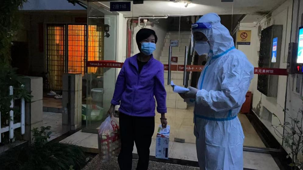 学生蔡尧在鼓楼区某社区封闭楼栋发放物资