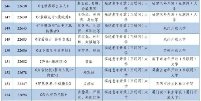 为深入学习贯彻党的二十大精神和习近平新时代中国特色社会主义思想,落实习近平总书记关于老龄工作重要指示精神,服务积极应对人口老龄化国家战略,扩大老年教育供给,今年4月起,福建老年开放(互联网)大学积极组织全省分校参与由国家开放大学主办的“2022年全国老年教育教学成果展暨全国教育短视频征集和展示活动”,本次活动共收到全省各分校作品35个。作品的主题鲜明,内容丰富,风格多样,从不同视角展现了我省老年教育的成果、成效——学习新知识、了解新文化,掌握新技能、结交新朋友、开拓新视野、充实精神生活,作品充满对生活的热爱和喜悦,体现了老年学员满满的获得感、幸福感和安全感。