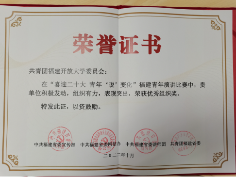 近日,学校团委在由中共福建省委宣传部、中共福建省省委网信办、中共福建省委讲师团和共青团福建省委联合举办的“喜迎二十大 青年‘说’变化”福建青年演讲比赛中荣获“优秀组织奖”。