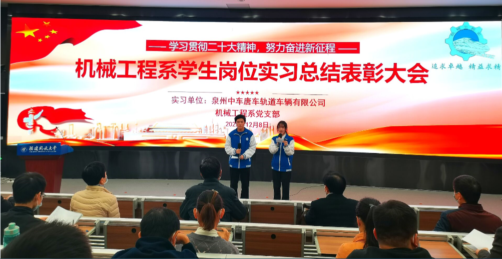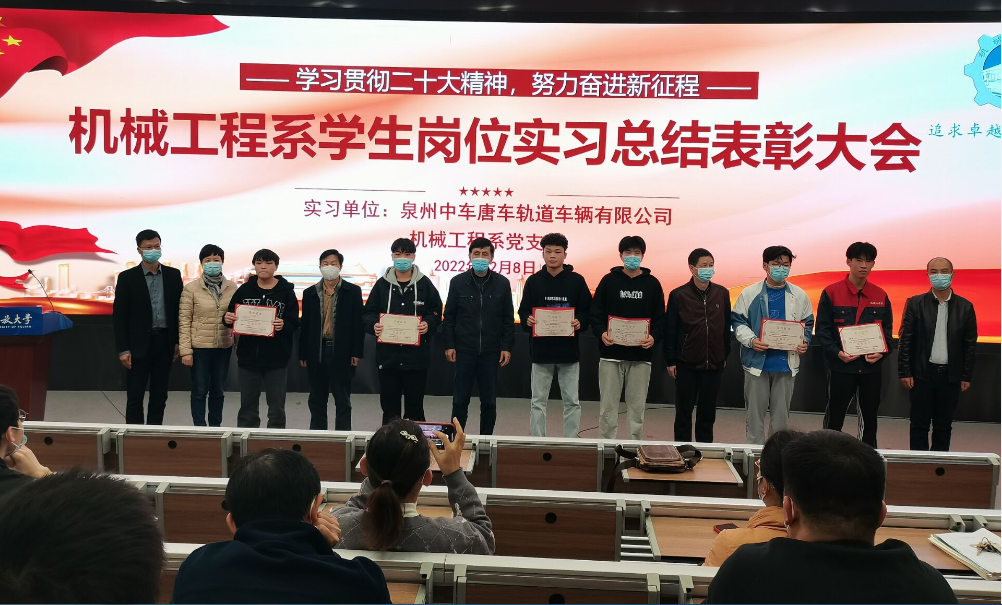 接着,五个实习小组的代表从实习前准备、岗位操作内容、实习生活、实习感悟,实习总结等方面多方位、多角度汇报了各实习小组具体工作表现,检验和巩固了2020级制造类专业学生在校期间所学习的专业基础理论知识和专业技能。同学们在岗位实习工作中表现出来的品格修养和行为作风,得到了泉州中车唐车轨道车辆有限公司领导、班组长和驻点指导老师们的一致认可和高度评价,其中有11名同学经企业和学校综合评定,获得“实习标兵”和“实习先进分子”称号,分别是:
