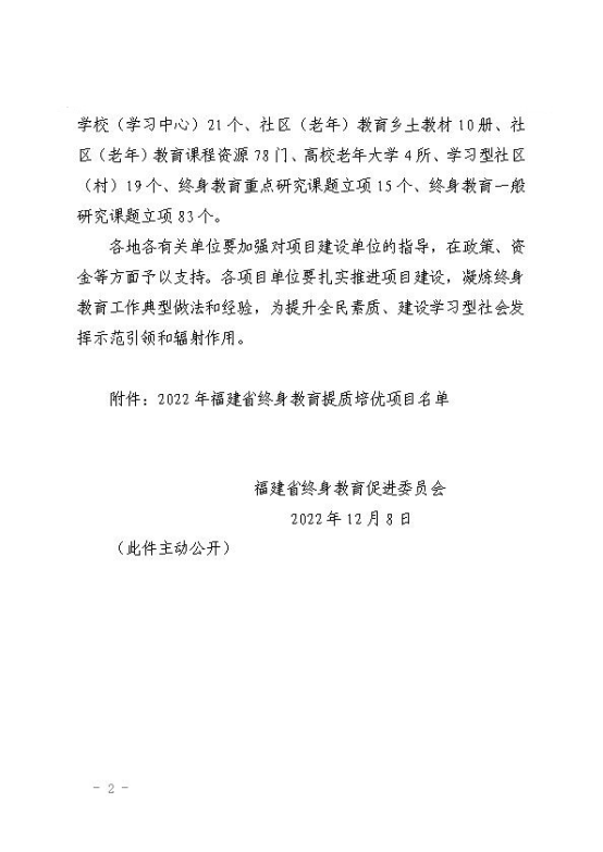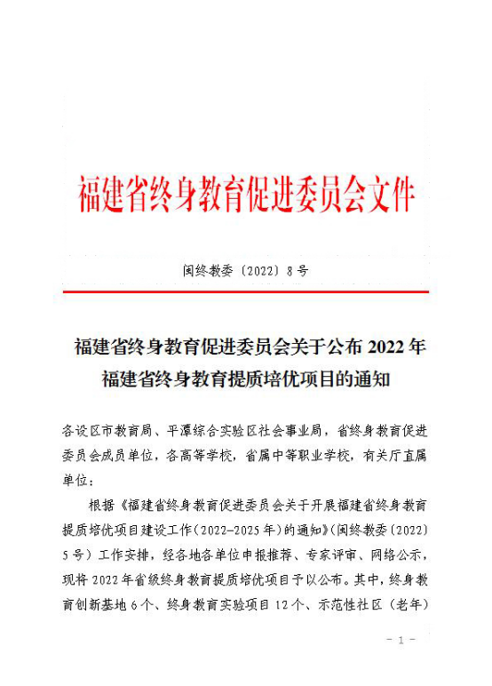 为进一步推进我省终身教育高质量发展,落实《福建省“十四五”教育发展专项规划》,终身教育服务中心协助省教育厅开展终身教育提质培优项目,协力制定《福建省终身教育促进委员会关于开展福建省终身教育提质培优项目建设工作(2022-2025年)通知》,并做好项目的推动、组织、实施等工作,推动我省终身教育工作再上新台阶。