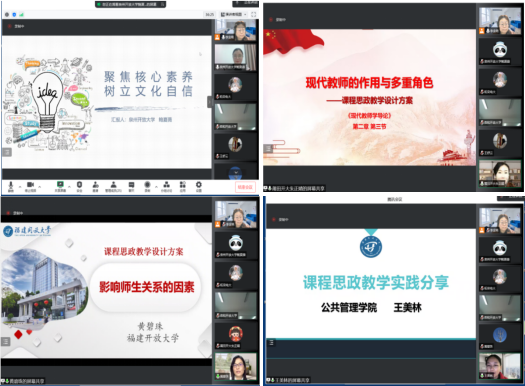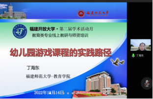 本次培训分学术讲座和经验分享两个环节。学术讲座环节邀请了福建师范大学教授、博士生导师丁海东开展《幼儿园游戏课程的实践路径》学术讲座。在经验分享环节,全省系统国开课程思政比赛部分获奖教师、学前教育本专科主任、小学教育专业班主任分别立足一线教学、专业团队、教学管理作了经验分享。泉州分校鲍夏薇、莆田分校朱正婧、公共管理学院黄碧珠与王美林分别介绍了《小学语文教学研究》《现代教师学导论》《影响师生关系的因素》《学前教育原理》课程的课程思政设计思路和体会;学前教育专科专业主任陈瑶介绍了新规则变化调整情况,回应了基层反映较多的疑难问题;学前教育专业本科专业主任李金艳汇报了“注重实践能力,突出多元评价”学前教育专业改革成果;小学教育专业班主任丁陈蔚就新生入学、日常管理、毕业环节进行了详细的经验分享。