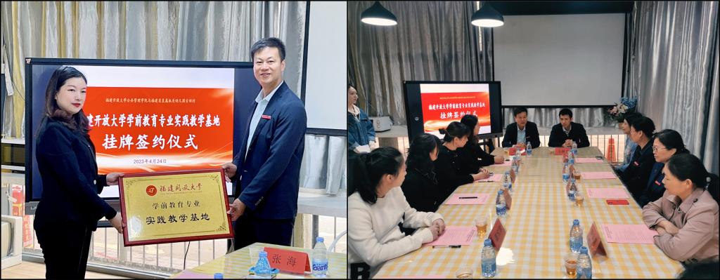 为了深化人才培养实践教学环节改革,4月24日上午,公共管理学院院长张海、副院长李瑞中、系主任李金艳携教师代表赴福建省直属机关幼儿园古田村分园进行实践教学基地签约与挂牌仪式。幼儿园分管部门领导、福建省离休干部休养所所长王相玉出席本次仪式。