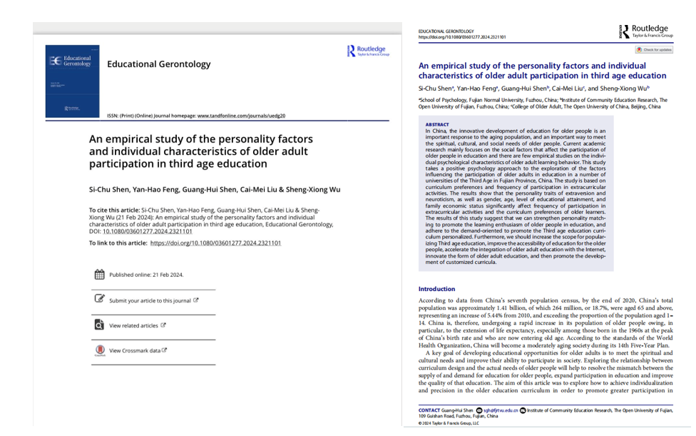 近日,我校沈光辉教授负责的全国教育科学规划教育部重点项目《基于大数据的我国老年教育供需匹配度动态监测与评价模型研究》(项目编号:DKA230448)的阶段性成果《An empirical study of the personality factors and individual characteristics of older adult participation in third age education》(译为《影响老年教育参与度的人格因素与个体特征实证研究——基于课程偏好与活动频率的视角》)在国际老年教育领域高影响力的SSCI期刊《教育老年学》发表。文章以个体心理特征对学习行为的实证研究为切入,从积极心理学的角度探究了福建省多所老年大学老年教育学员参与度的影响因素,研究结果表明,人格特质中的外倾性和神经质以及学习者个体特征中的性别、年龄、受教育程度、家庭经济状况等,会显著影响老年学员课外活动参与频率与课程偏好类型。针对研究分析结果,文章从个性匹配、需求导向以及提高老年教育的可及性等方面提出建议对策,以期推进老年教育的融合、创新与个性发展。