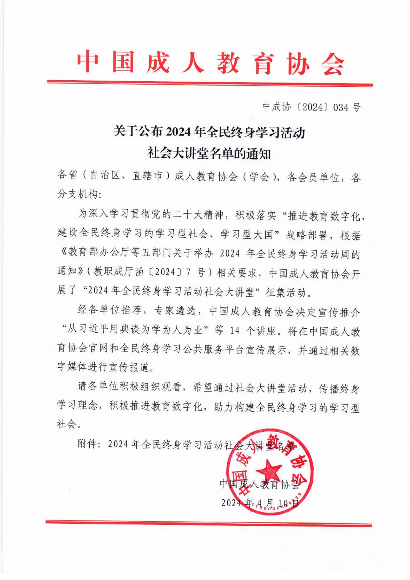 近日,从中国成人教育协会下发的《关于公布2024年全民终身学习活动社会大讲堂名单的通知》中获悉,由我校家庭教育研究所客座教授、所长连榕(福建师范大学二级教授,教育部中小学心理健康教育专家指导委员会委员)主讲的“大手牵小手 适应新学期”开学家长第一课,入选“2024年全民终身学习活动社会大讲堂”名单,后期将在中国成人教育协会官网和全民终身学习公共服务平台宣传、推介、展示,并通过相关数字媒体进行宣传报道。