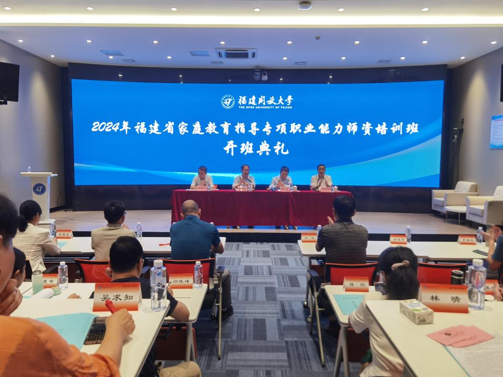 4月16日,由我校和福建省职业技能鉴定指导中心举办的2024年福建省家庭教育指导专项职业能力师资培训班在左海校区举行开班仪式。省职业技能鉴定指导中心主任陈捷、副主任任鹏飞及来自省内各开放大学、中小幼骨干教师、职业培训机构培训师及从业人员50余人参加开班仪式。校党委委员、副校长吴建铭出席开班式并致辞。仪式由培训学院院长江克英主持。