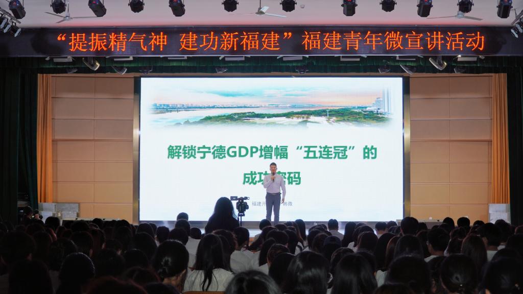 来自福建青年讲师团和省习近平新时代中国特色社会主义思想研究中心新思想青年宣讲团等青年讲师走近高校青年,锚定“青年志”、善用“青年话”、增进“青年情”,以青年之声传递青年理想、凝聚青年力量,开展了一场别开生面的宣讲活动。我校马克思主义学院教师韩微以“弱鸟先飞”的宁德发展实践为例,讲述了“扶贫先扶志”“唱山歌”“念海经”等故事,对宁德GDP增幅“五连冠”的成功密码进行解读,引导青年学生铭记习近平总书记的嘱托,增强服务人民、回报家乡的责任感、使命感,为乡村振兴贡献磅礴的青春力量。宣讲引发现场观众的共鸣,获得好评。