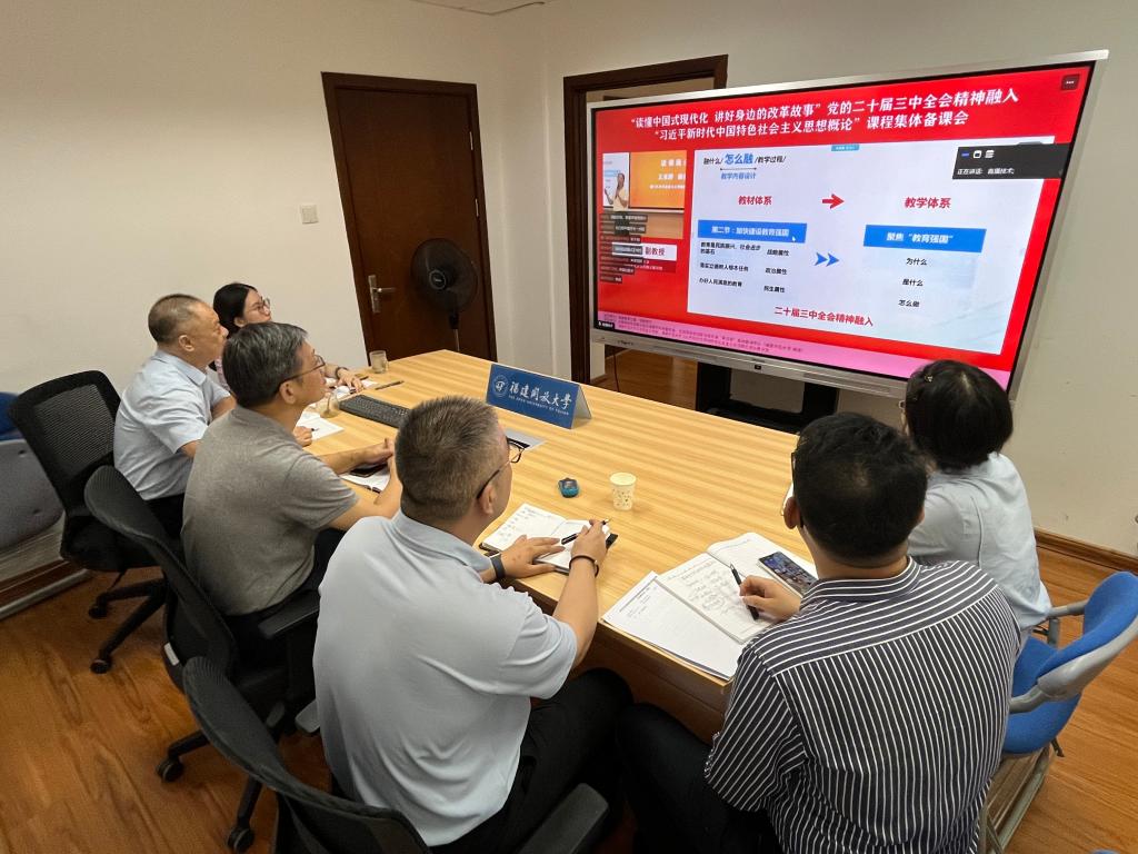主课堂备课会后,在学校分课堂现场,马克思主义学院的参会教师就党的二十届三中全会精神融入思政课教学主题进行了初步的交流研讨。马成斌在听完大家的汇报后作了指导讲话,他强调,要及时跟进学,把党的二十届三中全会精神融入思政课程,把党的最新理论要义讲深、讲透、讲活,不断丰富思政课内涵;要遵循思政课教学规律,创新教学方法,坚持问题导向,站在更高维度上为学生解惑释疑,充分激发学生学习的主体性与积极性;要加强“大思政课”建设,用好、讲好身边的改革故事,强化实践教学,教育引导学生把青春华章写在祖国大地上;要夯实思政课教师团队建设,丰富思政课教师培训研修研学的路径,加强与省内高校和兄弟开大的沟通交流,切实提升思政课教师的教研能力和水平。