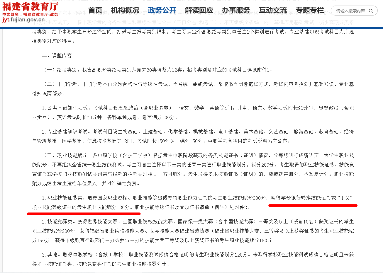 日前,省教育厅印发《关于调整福建省高职院校分类考试招生(面向中职学校毕业生)实施办法的通知》,对我省高职院校分类考试招生(面向中职学校毕业生)实施办法作出调整。各中职学校(含技工学校)根据考生中职阶段获取的各类技能证书(证明)情况,分等级进行成绩认定,为学生职业技能赋分,不再组织全省统一职业技能测试。通知明确学分银行转换技能证书纳入其中,赋分180分。