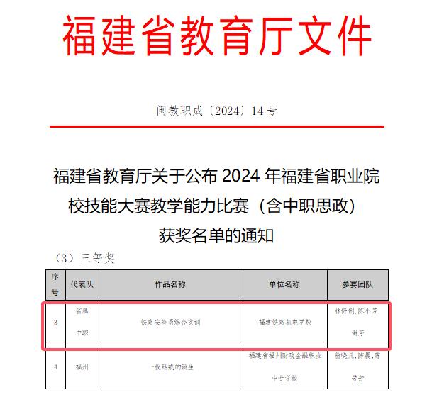 2024年福建省职业院校技能大赛教学能力比赛获奖名单正式公布,林舒俐、陈小芳、谢芳三位教师的作品《铁路安检员综合实训》斩获三等奖。