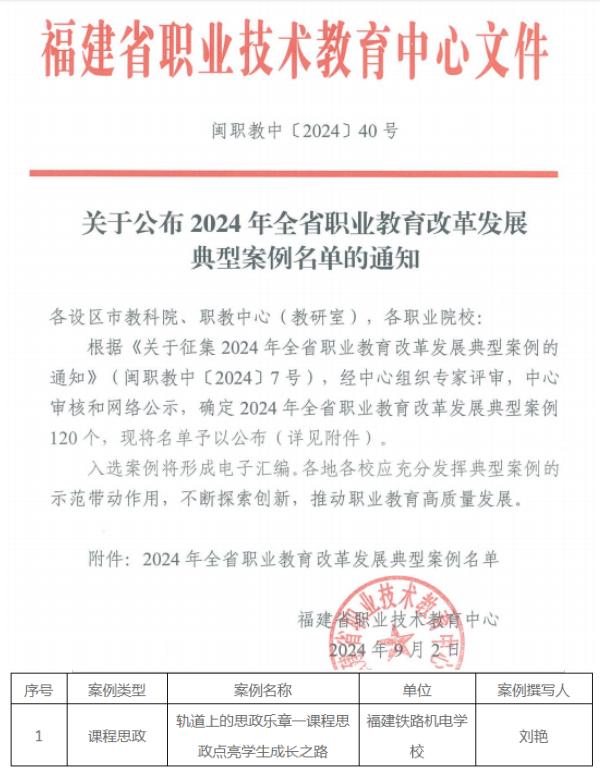 福建省职业技术教育中心公布了2024年全省职业教育改革发展典型案例名单,由刘艳老师撰写《轨道上的思政乐章——课程思政点亮学生成长之路》入选“课程思政”类型典型案例。
