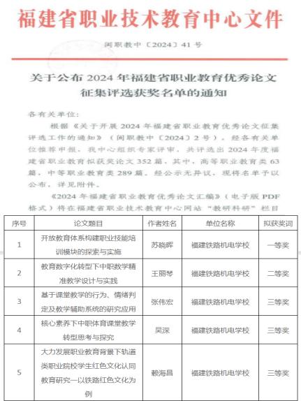 福建省职业技术教育中心发布《关于公布2024年福建省职业教育优秀论文征集评选获奖名单的通知》,学院共有五位老师的论文获奖,其中苏晓晖获一等奖,王丽琴获二等奖,张伟宏、吴深、赖海昌获三等奖。