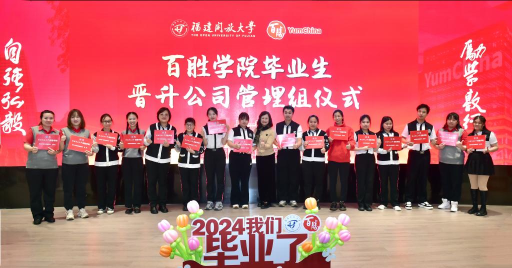 寒暑六载携手共育,春华秋实硕果满枝。为深入总结校企合作办学阶段性成果,持续推进校企融合育人的实践与探索,12月20日下午,学校在左海校区智慧教室举行百胜学院校企合作办学阶段性成果总结表彰暨2024年毕业典礼。毕业典礼通过线上线下互联互通的方式举行,学校党委委员、副校长李正光,百胜餐饮(福州)有限公司肯德基品牌营运副总经理唐菲出席并致辞。学校及百胜餐饮(福州)有限公司相关部门负责人、教师代表、百胜学院毕业生代表等60余人线下参加典礼,闽潮地区百胜学员通过云端直播线上参与仪式。