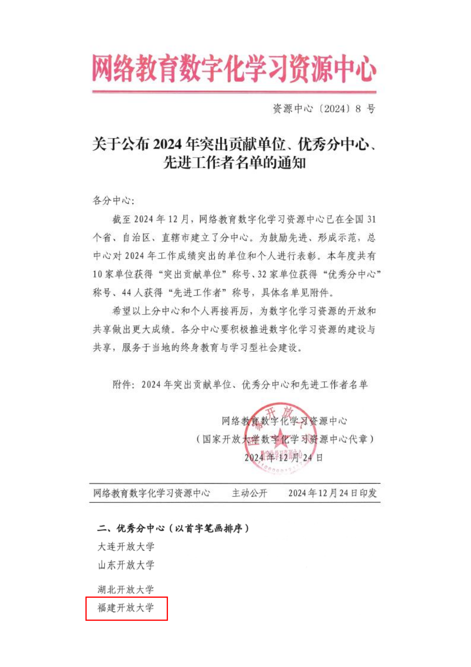 会议还表彰了2024年度优秀单位,公布了优秀数字化学习资源获奖名单。我校喜获2024年度“优秀分中心”“优秀组织单位“和“先进工作者”称号。我校马克思主义学院与资源建设与管理中心联合制作的教学视频《追求远大理想 坚定崇高信念》入选优秀数字化学习资源名单。