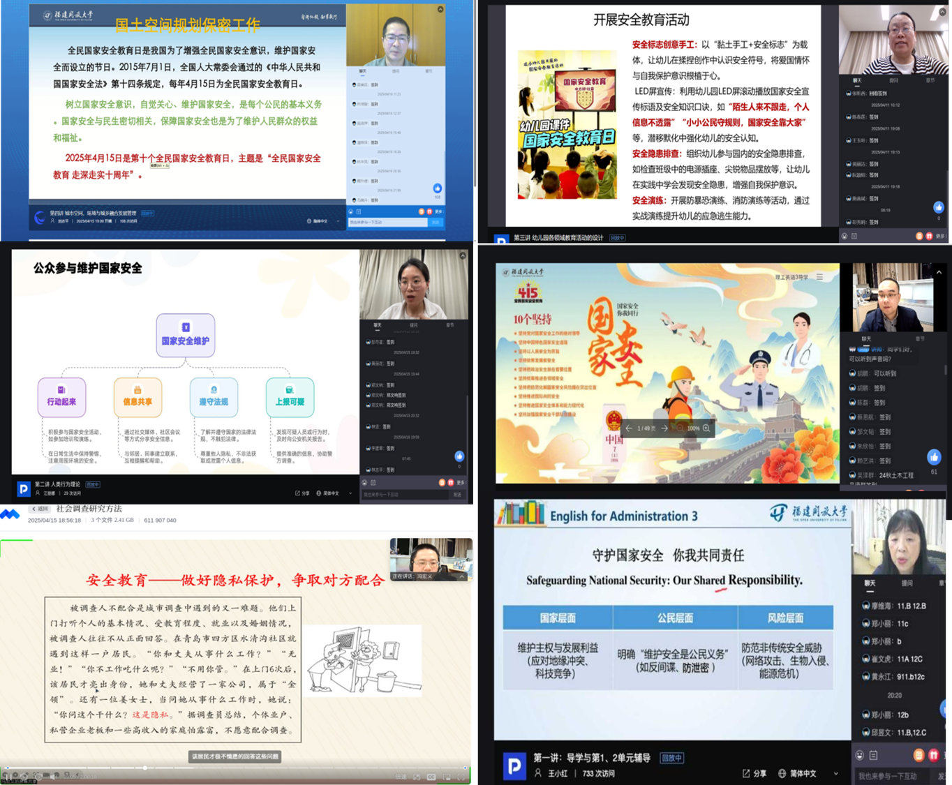 在第十个全民国家安全教育日到来之际,为引导广大学员深刻认识国家安全的丰富内涵与时代价值,公共管理学院教师党支部积极开展安全教育进课堂活动。各专业教师紧密结合课程特点,将安全教育知识巧妙融入直播课教学过程,取得了良好的教育效果。