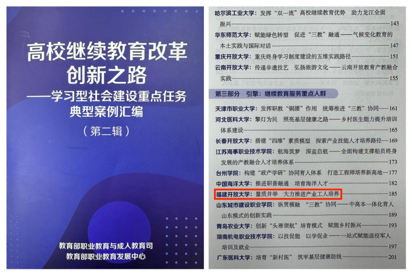 近日,我校继续教育教学改革创新项目《政策支撑·多元融通·协同创新·服务赋能——福建开放大学产业工人学历与技能提升专项行动》入选教育部《高校继续教育改革创新之路——学习型社会建设重点任务典型案例汇编》,汇编共呈现52个项目案例,覆盖全国不同类型高校,具有较强的代表性。