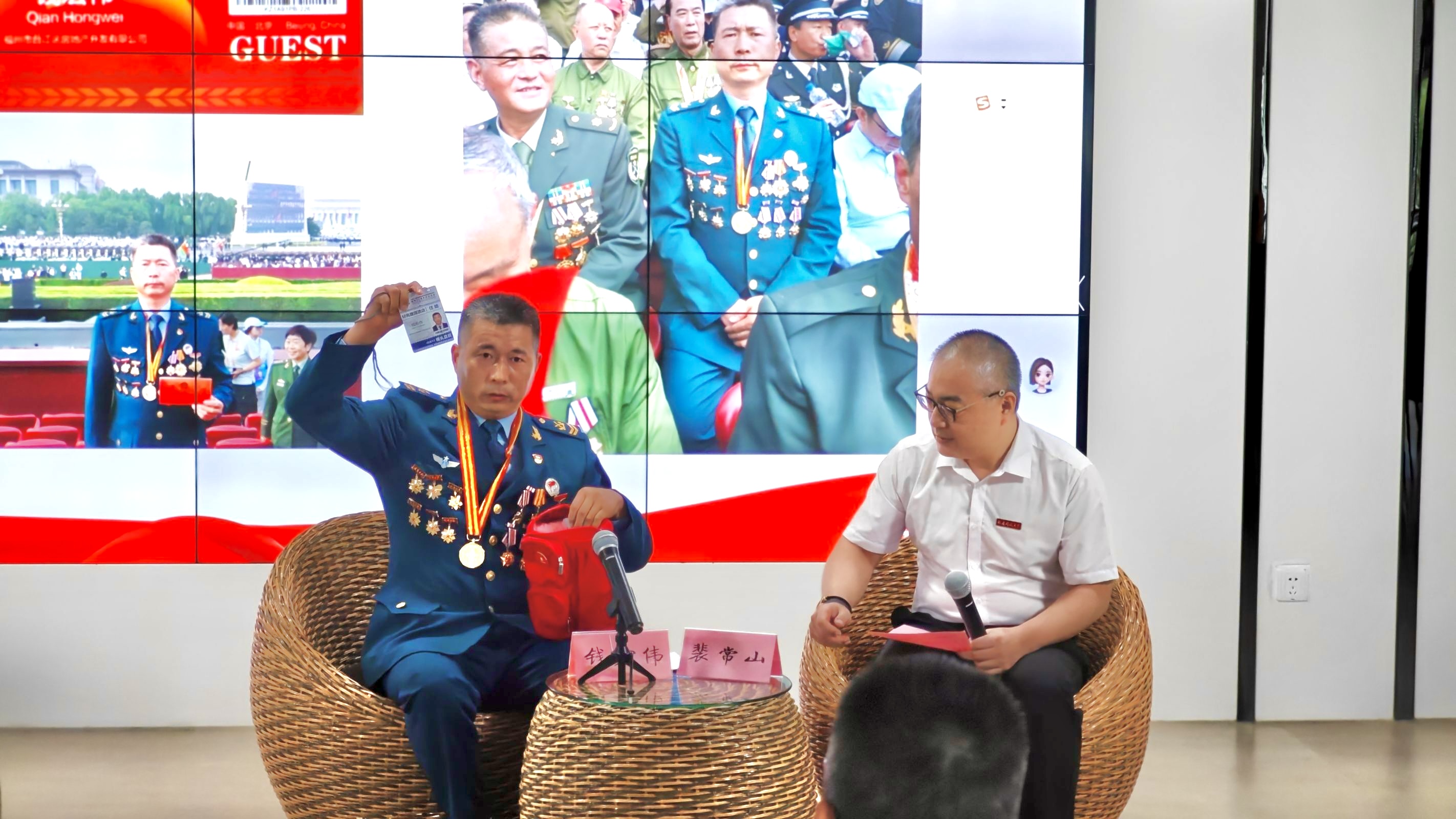 活动特别邀请了全国最美志愿者、福建省五一劳动奖章获得者、学校劳模(工匠)班优秀校友钱宏伟现场访谈。今年,他受邀赴北京参加观礼纪念中国人民抗日战争暨世界反法西斯战争胜利80周年大会,见证了国家国防力量。访谈中,钱宏伟展示了阅兵式发放的纪念包,分享了参加大会的心情,介绍了印象深刻的新型装备,并对学妹学弟在日常生活中践行国防责任进行了指导。通过他的讲述,现场师生充分感受到祖国的强大与民族的尊严,深化了对国防意义的认知。
