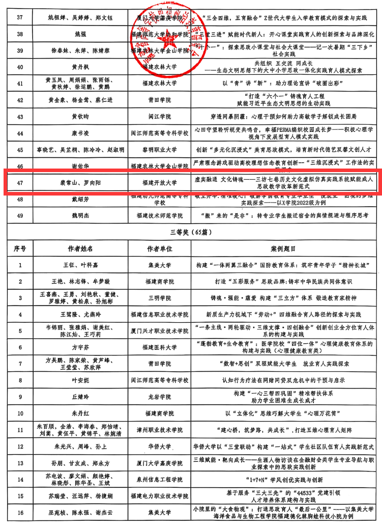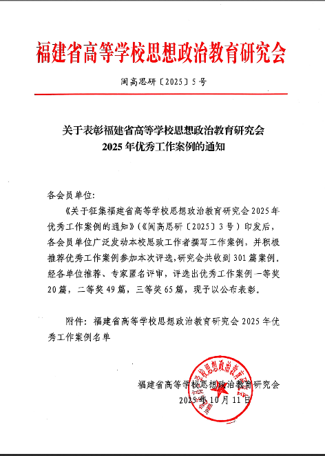 近日,福建省高等学校思想政治教育研究会发布《关于表彰福建省高等学校思想政治教育研究会2025年优秀工作案例的通知》(闽高思研〔2025〕3号)。经各单位推荐、专家匿名评审,我校马克思主义学院裴常山、罗向阳报送的《虚实融通 文化铸魂——三坊七巷历史文化虚拟仿真实践系统赋能成人思政教学改革新范式》,获福建省高等学校思想政治教育研究会2025年优秀工作案例二等奖。