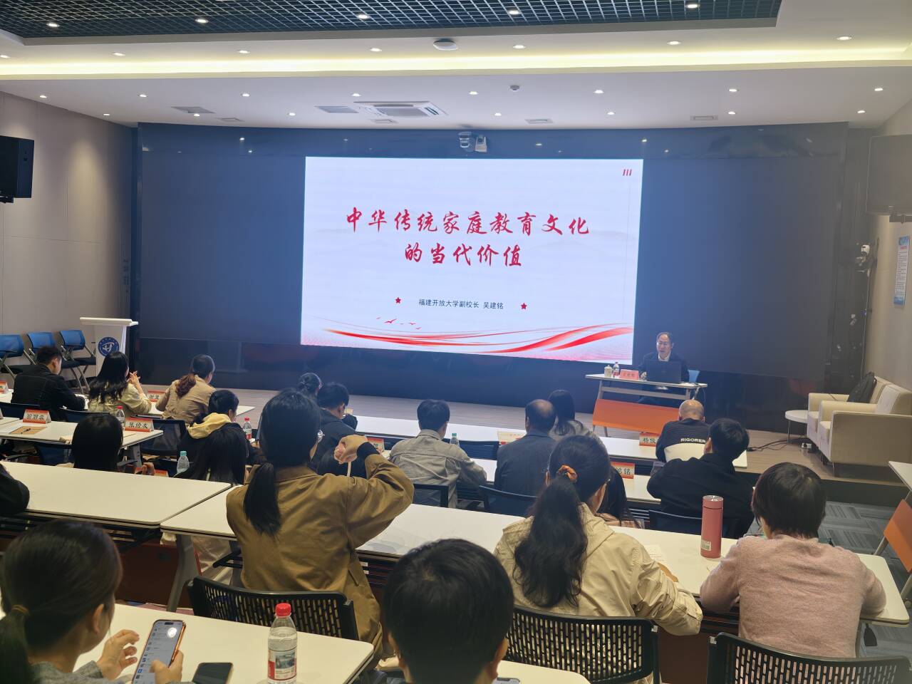 讲座中,吴建铭以中华传统家庭教育文化为脉络,结合习近平总书记关于注重家庭家教家风建设的重要论述精神,引经据典、深入浅出。从诸葛亮《诫子书》“静以修身,俭以养德”的修身之道,到《朱子家训》“恒念物力维艰”的持家理念,再到焦裕禄、谷文昌等新时代榜样的家风传承故事,系统阐释了家庭家教家风在中华历史文化中的的深厚底蕴与时代意义,激发了参训班主任传承优良家风、践行家庭教育指导的内生动力。
