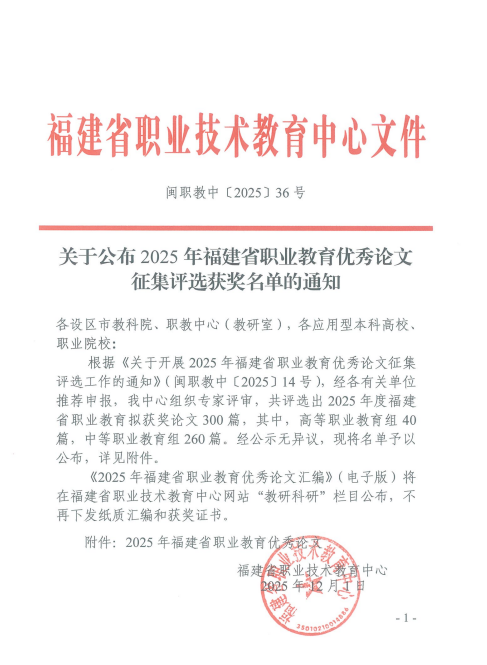 近日,福建省职业技术教育中心发布《关于公布2025年福建省职业教育优秀论文征集评选获奖名单的通知》,职业学院教师积极参与、深耕教研,共4篇论文在评选中斩获佳绩。