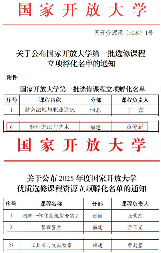 在课程立项方面取得积极进展:在国家开放大学优质选修课程资源立项中,学校《管理方法与艺术》课程入选首批选修课程立项孵化名单并已完成建设;《影视鉴赏》与《工具书与文献检索》两门课程入选第二批立项孵化名单。