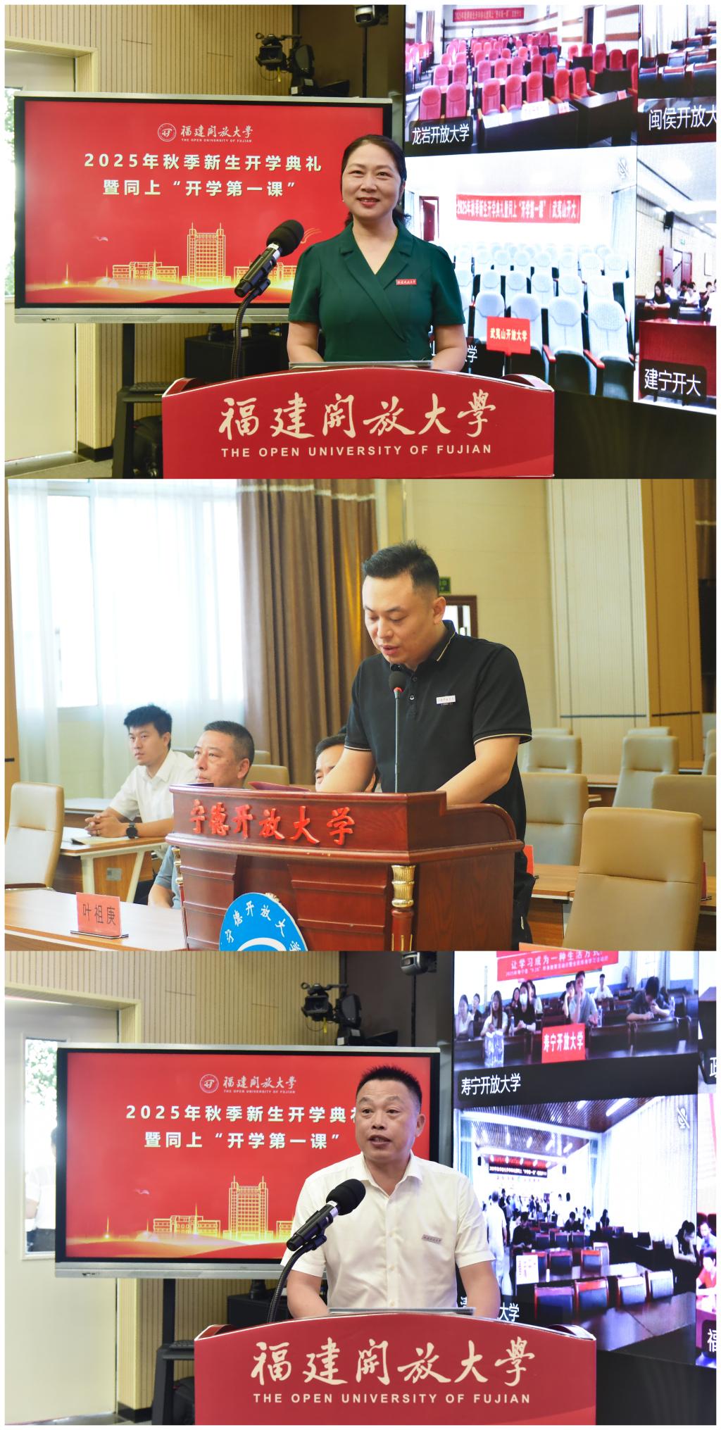 理工学院副教授王慰娟代表教师发言。她结合自身从教体会与新生共勉,并代表全体教师郑重承诺,将恪尽职守,助力学生成长成才。宁德开放大学时代智匠学院2024春机械设计制造及其自动化本科班学生范江涛代表在校生在宁德分会场发言,公共管理学院2025秋劳模(工匠)行政管理本科班学生方茂代表新生在主会场发言。他们从不同角度分享了自己求学、成长的历程,彰显了开放教育在助力学生成长成才、支撑终身学习方面的育人成效。